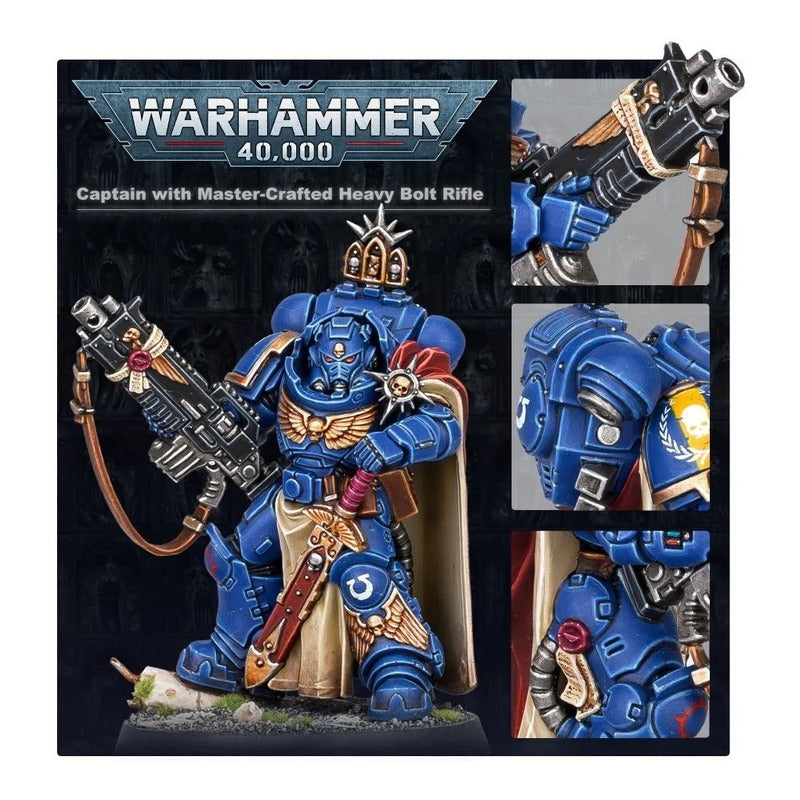 Los Marines Espaciales luchan con una furia tenaz en defensa. Algunos Capitanes van equipados con rifles bólter pesados para descargar ráfagas de castigo y protegidos con una armadura Gravis para resistir los mejores intentos del enemigo por expulsarlos del objetivo. Luchando así, son un símbolo de la indomable voluntad de no fallar nunca de los Marines Espaciales.