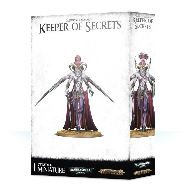Un Keeper of Secrets es un Greater Daemon of Slaanesh, un guerrero consumado, maestro hechicero de las huestes del Príncipe Oscuro. Sus cuatro extremidades poderosas se mueven lánguidamente mientras se deslizan hacia delante, sólo para explotar en un movimiento letal cuando su presa está al alcance. El Keeper of Secrets es el más poderoso y peligroso de los servidores de Slaanesh: elegante, rápido y absolutamente mortífero. En el campo de batalla, estos combatientes pueden atacar a través de formaciones de infantería y armaduras pesadas por igual con una serie de ataques. Cada uno es también un hechicero capaz de desatar magia repugnante con la que seducir a sus enemigos o destruirlos por completo, y un comandante consumado que mejorará las unidades próximas a Slaanesh. Incluso podrás usarlo tanto en Warhammer Age of Sigmar como en Warhammer 40,000. Con este kit puedes montar un Keeper of Secrets y presenta una serie de opciones de personalización que incluyen una opción de cabeza, armas y garras empaladoras, lo que te permite desplegar a muchos de este monstruo y dotarlos de un aspecto distinto. Además, este kit puede usarse alternativamente para montar al hérie Daemon Shalaxi Helbane. Este set consta de 51 piezas de plástico e incluye una peana redonda de 100 mm.