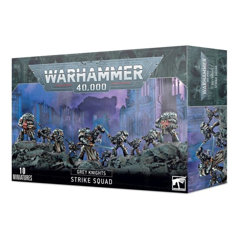 Las Strike Squads a menudo forman la vanguardia de una fuerza de asalto de Grey Knights. Equipados con armaduras más ligeras que las principales escuadras de Terminators, estos veteranos golpean con rapidez y precisión, y son capaces de colarse por huecos en las líneas enemigas. Al inicio de la batalla, el comandante Grey Knight asigna siempre a una o más Strike Squads para capturar posiciones vitales y objetivos clave, desplegándolas mediante teleportadores fijos para asegurar la pronta captura de ubicaciones apartadas o inaccesibles. Estas escuadras son esenciales; sin su reconocimiento y preparación, los Terminators serían como un martillo dando palos de ciego en la oscuridad. Este kit de plástico multicomponente contiene 10 Grey Knights con espadas de fuerza Némesis, y la opción de montar uno de ellos como el líder de unidad, un Justicar. Las miniaturas están cubiertas con las inscripciones, sellos de pureza y demás detalles que se esperan de este ejército, y el Justicar cuenta con una cabeza descubierta única. Se incluyen toda una variedad de armas y mejoras de unidad como sables Némesis, alabardas de fuerza Némesis, un martillo daemon Némesis, un bastón de protección Némesis, dos cañones-psi, un psilenciador y un incinerador. Esta caja de plástico multicomponente contiene 236 piezas y 10 peanas redondas Citadel de 32 mm con las que montar una Strike Squad de los Grey Knights. Nota importante: estas miniaturas también pueden montarse como Interceptor Squad, Purifier Squad o Purgation Squad.