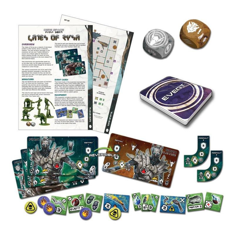 Las Puertas de Ry'sa son una red de portales interconectados a otros mundos, tiempos o realidades alternativas. Esta expansión para Core Space: First Born agrega una de estas puertas al juego junto con nuevas y poderosas amenazas First Born: Talos y Cerberosa.