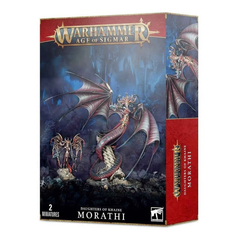 Este kit multicomponente de plástico contiene las piezas necesarias para montar a Morathi. Está representada por 2 miniaturas diferentes, ambas incluidas: la Oráculo Suprema de Khaine, su forma de aelf y la Reina de las Sombras, su auténtica y monstruosa forma. La Oráculo Suprema de Khaine es una figura de una belleza gélida, enfundada en una armadura ornamentada de cuero y metal. Su mano enguantada empuña la lanza mágica Arrancacorazones, con la que apunta a un enemigo. Bajo un gran tocado metálico, su larga cabellera (en la que hay trenzados ganchos y cuchillas) le cubre la espalda. Las alas de su espalda están extendidas y de ellas gotea sangre.