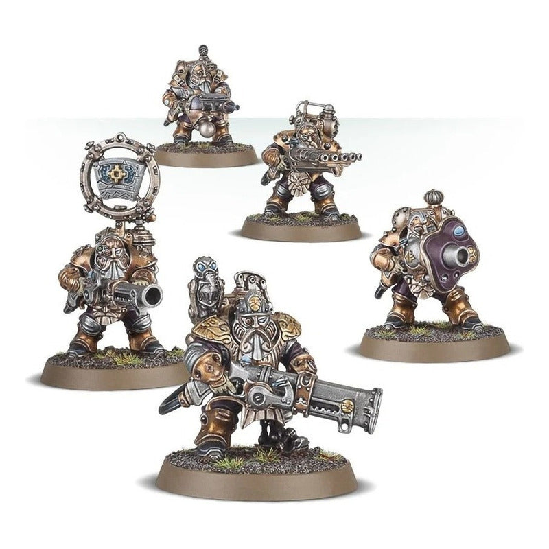 Este kit de plástico multicomponente contiene las piezas necesarias para montar 5 Grundstok Thunderers, soldados profesionales y la principal fuerza de combate de los Kharadron Overlords. Todos van armados con rifle tiroaetérico, con las toda suerte de impresionantes armas especiales disponibles como opciones: fumigador aetérico, mortero Grundstok (con un proyectil adicional para adornar la peana), un cañón tiroaetérico (tan potente que el duardin que lo lleva necesita de un escudo para protegerse de la descarga) y un arma de cinco cañones conocida como barrecubiertas. Sus trajes sellados están cubiertos de válvulas, tuberías y sistemas de respiración para que el aire sea respirable en sus pulmones tiznados de oro aetérico.