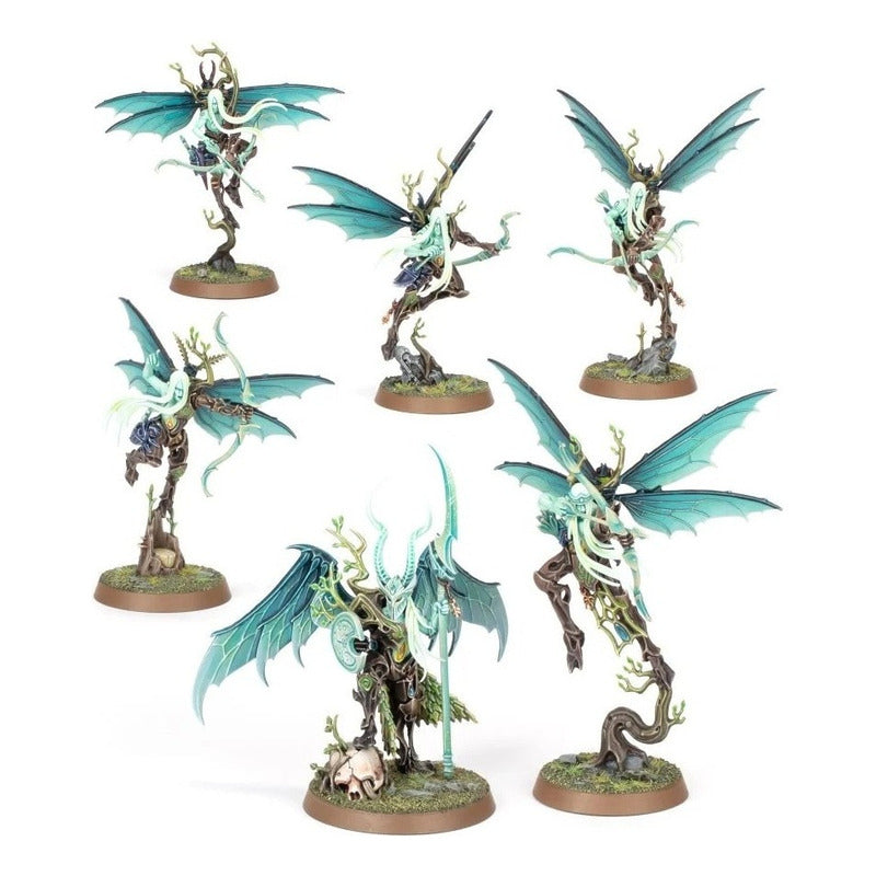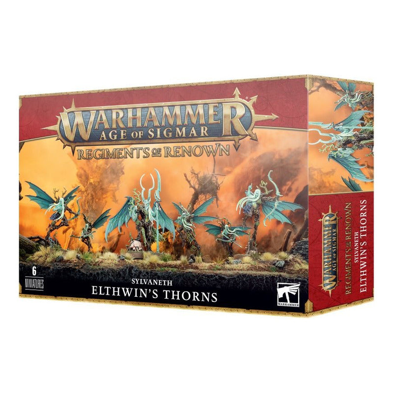 Los Regimientos de Renombre son mercenarios de renombre que vagan por los Reinos Mortales, ofreciendo sus servicios a cualquier ejército que les ayude a alcanzar sus propias ambiciones. Dirigidos por guerreros famosos e infames por igual, estos perros de la guerra reclutan a soldados afines para que se unan a ellos en sus búsquedas para llenar sus arcas y aumentar su reputación. Uno de estos guerreros es el Archiaparecido de Sylvaneth, Elthwin. Apartado del canto espiritual de la Everqueen por la locura contagiosa de una horda macabra, este paria alado y sus compañeros aéreos vagan por los reinos, buscando una forma de evitar la locura y regresar a la corte de Alarielle. Este lote contiene todas las miniaturas necesarias para montar las Espinas de Elthwin, un Regimiento de renombre completo para usar en partidas de Warhammer Age of Sigmar. Esta banda voladora de guerreros Sylvaneth atormentados está liderada por Elthwin, un Archiaparecido cuya perspicacia sobrenatural guía las flechas de sus seguidores hacia su blanco. A ella se unen cinco revoloteantes Arqueros Cendales, ágiles criaturas que provocan un espantoso destino a cualquier enemigo alcanzado por sus puntas de flecha, ya que voraces larvas lo devoran desde dentro. Este set contiene: - 1 Archiaparecido - 5 Arqueros Cendales Las miniaturas de este set se suministran con las peanas apropiadas y vienen desmontadas y sin pintar. Recomendamos usar pegamento para plástico Citadel y pinturas Citadel. Si tu ejército tiene un general del Orden pero no es un ejército Sylvaneth, puedes incluir este Regimiento de Renombre incluso si su valor en puntos excede la cantidad permitida para unidades aliadas. Alternativamente, las miniaturas de este lote también pueden cumplir sus funciones estándar en el campo de batalla en un ejército Sylvaneth, pero no se beneficiarán de sus reglas de Regimiento de Renombre. Las reglas específicas de los Regimientos de Renombre se pueden encontrar en la White Dwarf 486 (Marzo 2023). Las reglas digitales completas, así como consejos sobre cómo desplegar esta unidad en partidas de Warhammer Age of Sigmar, también están disponibles para su descarga en el sitio web de Warhammer Community.