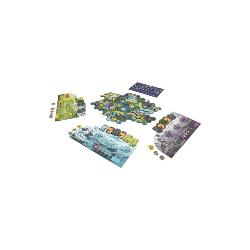The Wolves es un juego de estrategia de creación de manadas para 2-5 jugadores. Es la supervivencia del más apto mientras compites para formar la manada más grande y dominante reclamando territorio, reclutando lobos solitarios y cazando presas. Pero ten cuidado de no expandirte demasiado imprudentemente hacia terrenos donde tus rivales prosperan, ya que pueden alejar a los miembros de tu manada. Un mecanismo inteligente de selección de acciones impulsa tus elecciones. Cada acción requiere que voltees las fichas de terreno que coincidan con el terreno donde deseas realizar tu acción. Estas fichas de doble cara significan que las acciones que realices en esta ronda establecerán en qué tipos de terreno podrás actuar en la siguiente ronda. A medida que tomas medidas para expandir el control de tu manada en cada región, también mejorarás los atributos de tu manada, lo que te permitirá tomar acciones más agresivas a medida que avanza el juego. Hay 3 fases de puntuación a mitad del juego donde se calcula el poder en cada región. Al final del juego, los jugadores sumarán puntos según las fichas de PV obtenidas en estas fases de puntuación y el número de PV más alto revelado en cada una de las 6 pistas de su tablero de jugador. ¡El jugador con más PV gana! Contenido: 1 tablero de inicio 10 juntas regionales 5 tableros de jugador de doble cara 1 tablero de luz de luna de doble cara 30 losas de terreno de doble cara 20 Meeples lobo alfa Paquete de 40 meeples de lobo 60 guaridas 20 guaridas 20 fichas de lobo solitario 20 fichas de presa 10 fichas de puntuación de región 50 fichas de PV 12 fichas de acción extra 12 losetas de terreno extra 5 tarjetas de referencia 1 libro de reglas Edades: 14+ Jugadores: 2-5 Duración del juego: 75 minutos